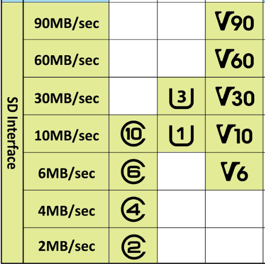 <figure><img src="https://1282083284-files.gitbook.io/~/files/v0/b/gitbook-x-prod.appspot.com/o/spaces%2F5A2PNyzG80QTDoltbtvZ%2Fuploads%2FVoj4IOpO9hPLGMwKbk3S%2Fimage.png?alt=media&#x26;token=9203a755-8d84-4b98-b2d9-c144f0696d92" alt=""><figcaption><p>Snapshot from Speed Class chart, credit <a href="https://www.sdcard.org/developers/sd-standard-overview/speed-class/">https://www.sdcard.org/developers/sd-standard-overview/speed-class/</a></p></figcaption></figure>